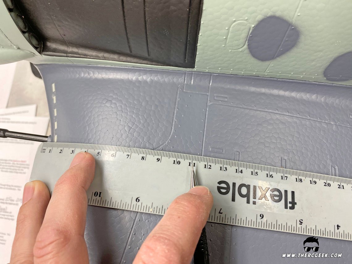 Lokasi CG yang direkomendasikan dalam manual adalah 105mm-120mm yang diukur dari lokasi pistol di dalam (lokasi istirahat sayap tepi terkemuka). Untuk penerbangan pertama, saya menembak CG di tengah kisaran itu dan di situlah ia tetap terasa hebat di sana. Ini setara dengan 110-115mm yang diukur dari lokasi pistol inboard terdepan.